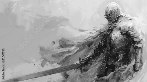 A brave knight in armor, hero element, sketch illustration, monochrome, isolated on white background