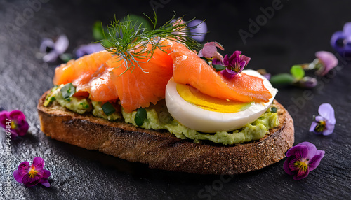 a, bread, slice, topped, with, salmon, egg, avocado, food, snack, salad, meal, appetizer, breakfast, plate, healthy, floral, macro, on, black, background, gourmet, lunch, white, fresh, ad, 3d