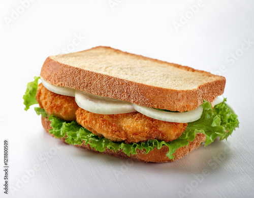 A breaded chicken patty sandwich with lettuce and onion rings on toasted bread.