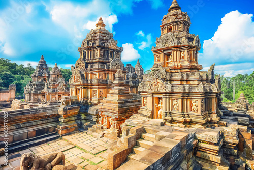 A breathtaking ancient temple complex with intricate carvings and statues, set against a vibrant blue sky.