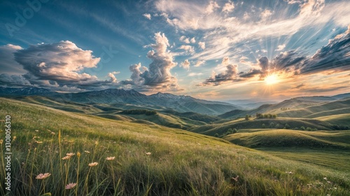 A breathtaking landscape of rolling green hills with a golden sunset and dramatic cloud formations, creating a peaceful and majestic scene..