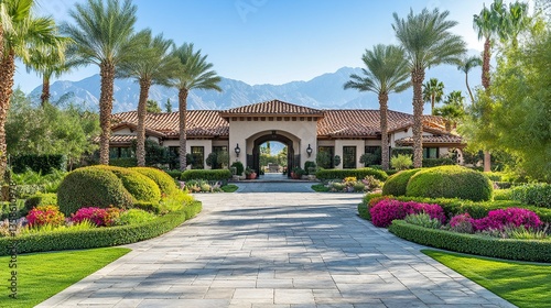 A breathtaking luxury home with symmetrical landscaping, including vibrant bushes and stone pavers, perfectly framed by the sunny backdrop.