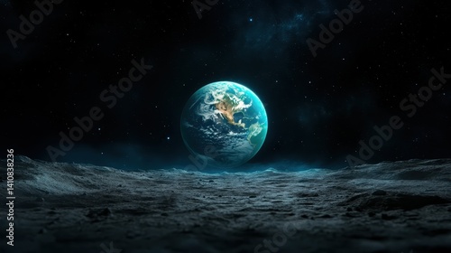 A breathtaking view of Earth from the Moon's surface, capturing the beauty of our planet against the backdrop of a star-filled cosmic landscape at night.