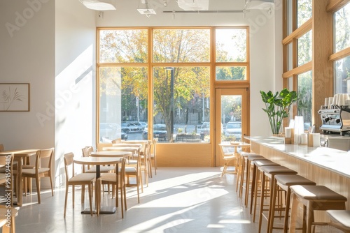 A bright and airy modern cafe interior featuring light wood furnishings and large windows