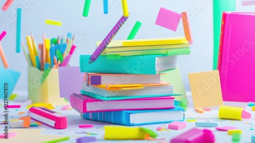 A bright, energetic image of colorful notebooks stacked with highlighters and sticky notes scattered around them, set against a crisp white background