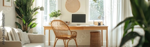 A bright home office featuring a desk, computer, and plants for a productive atmosphere.