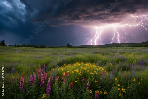 A bright lightning bolt over a meadow with colorful wildflowers under a stormy sky, Ai Generated