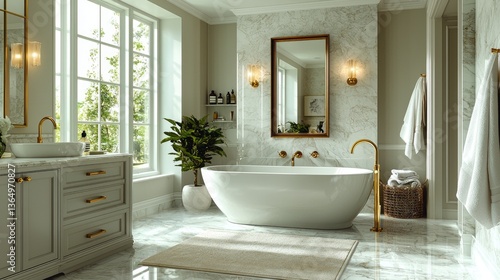 A bright luxurious bathroom with a freestanding bathtub and window