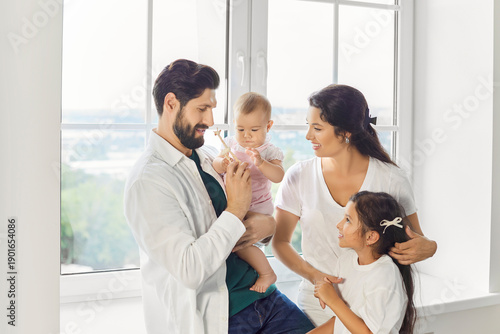 A bright moment of family togetherness. Candid photo of happy parents and children sharing playful bonding moments at a white window at home. Mother and little daughter look at father holding the baby