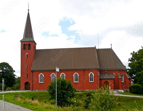 A bright red, classic building with a tall spire, surrounded by green trees under a partly cloudy sky. A small sign is in front