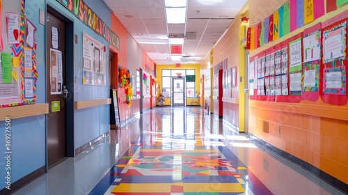 A bright school hallway adorned with vibrant student art and inspirational posters encourages creativity.