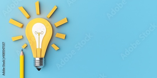 A bright yellow light bulb with rays, symbolizing creativity and innovation against a soft blue background.