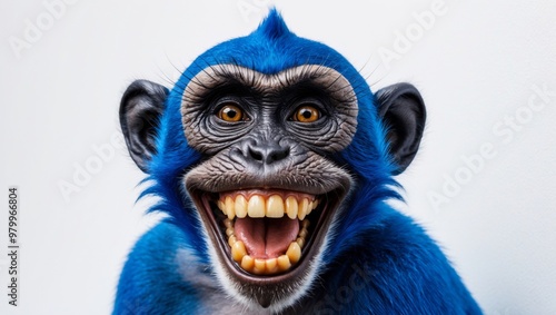 A brightly colored digital illustration of a blue monkey with a wide, toothy grin