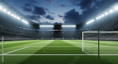 A brightly lit football stadium at dusk, with a clear view of the goal and manicured pitch