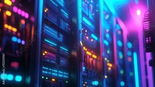 A brightly lit server room with rows of sleek, modern servers, blue and green LED lights flickering on the racks, cables neatly organized and running across the floor