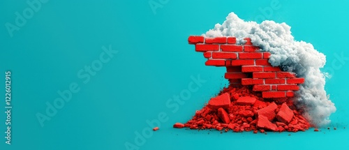 A broken brick wall with clouds, symbolizing disruption and transformation.
