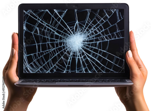 A broken laptop display screen with a crack in the glass is isolated for repair, damageg from a crash, showcasing the need for modern technology maintenance in business