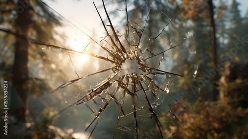 A broken mirror suspended in mid-air, cracks radiating from the center, reflecting a misty forest with golden sunlight piercing through the trees.