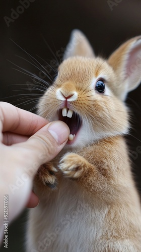 A brown and white rabbit bares its teeth and bites a hand reaching towards it