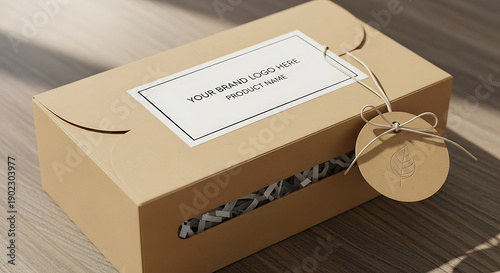 A brown cardboard box with a white label and twine tied tag on a wooden surface, viewed from above, showcasing packaging and shipping elements