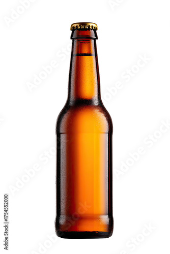 A brown glass bottle with a golden cap against a black background