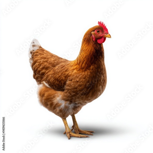 A brown hen standing on a white background in a studio setting isoleted on white background