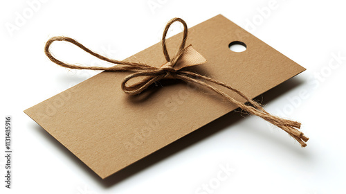 A brown tag with a bow tied around it