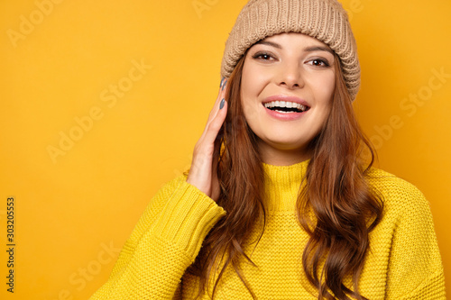 A brunette in a yellow sweater and hat stands on a yellow background and smiles into the frame while straightening her hair.