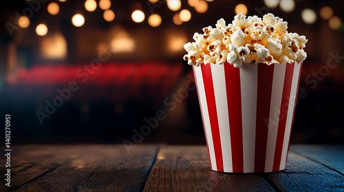 A bucket of freshly popped popcorn rests on a wooden table in a cinema hall, with ample space for promotional text or other elements in the image