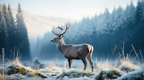 A bull elk in a cold morning meadow at forest. Generative AI.