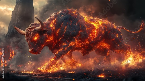 A bull forged from molten lava, charging across a volcanic landscape, its body glowing with cracks of fiery orange and red, smoke and embers swirling in its wake,