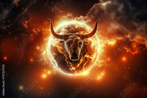 A bull with horns is engulfed by intense flames in this dramatic depiction