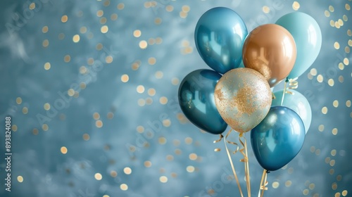 A bunch of balloons in blue and gold are floating in the air. The balloons are arranged in a way that they look like they are floating in the sky