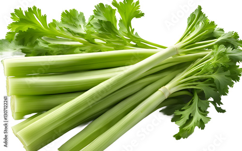 A bunch of celery stalks with leafy tops, isolated on a empty plain background