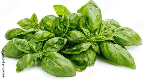 A bunch of fresh basil leaves, isolated on a white background, showcasing their vibrant green color.