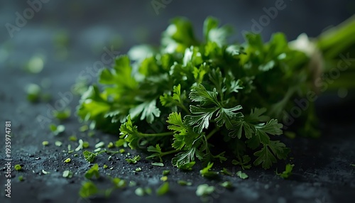 A bunch of fresh parsley leaves on a dark surface, ready for cooking