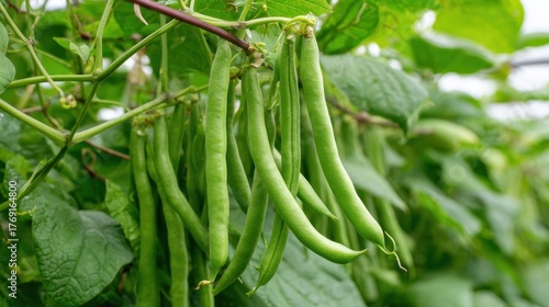 A bunch of green beans are hanging from a vine. The beans are green and are growing in clusters