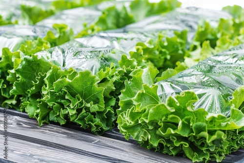 A bunch of green lettuce is wrapped in plastic