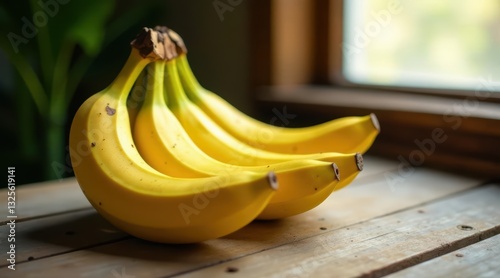 A bunch of ripe yellow bananas rests on a rustic wooden surface near a sunlit window.