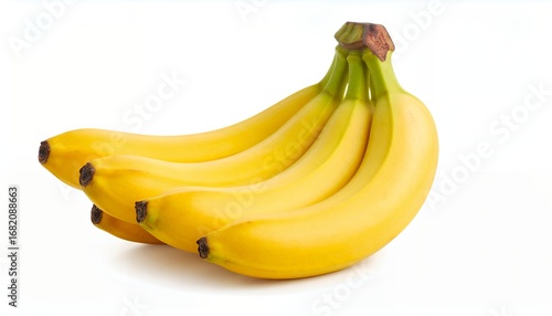 A bunch of ripe yellow bananas, with green stems, isolated on a white background.