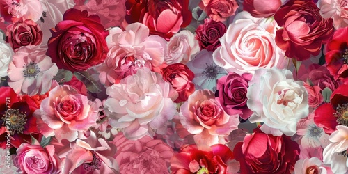 A bunch of vibrant red and white flowers adorn the surface of a wall