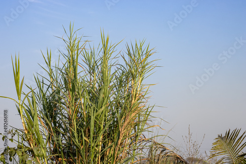A bunch of wild cane plants growing under the clean blue sky with copy space