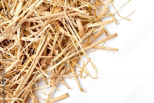 A bundle of dry hay sits on a clean, white surface