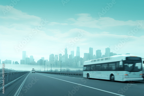 A bus is traveling along the highway with a city skyline in the distance under a cloudy sky