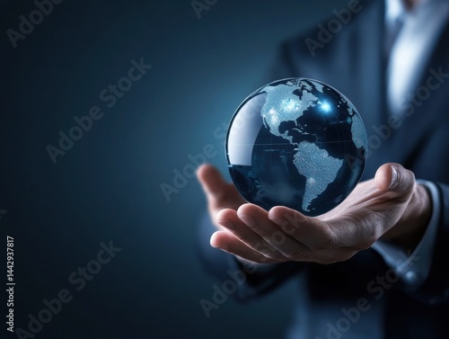 A business professional holding a glowing globe symbolizing global connectivity and innovation.