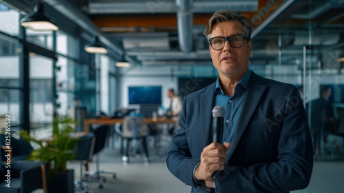 A businessman in a suit gestures expressively while speaking outdoors near modern office buildings.