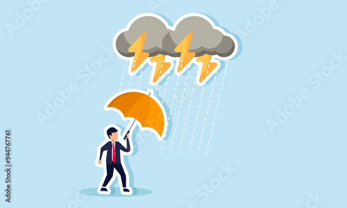 A businessman seeking shelter from a storm and heavy rain illustration concept of Seeking refuge from workplace issues or sheltering from the storm of recession