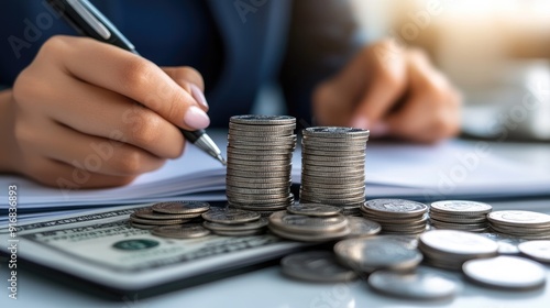 A businesswoman organizes stacks of coins while jotting down notes in a notebook at her office desk, focusing on budgeting and financial planning