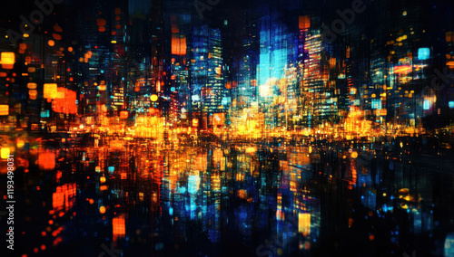A bustling city skyline glows brightly at night, featuring skyscrapers adorned with colorful lights. The shimmering water reflects the vibrant hues, creating a mesmerizing urban landscape.