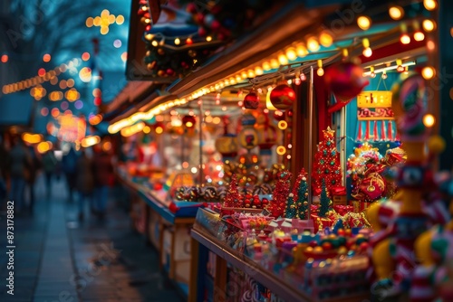 A bustling market filled with colorful stalls and twinkling lights, surrounded by joyful atmosphere. The scent of festive treats and drinks wafts through the air.